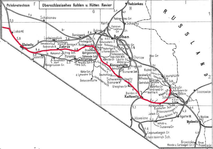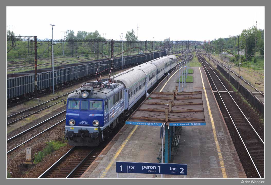 gehört zur heutigen Strecke Katowice (Kattowitz Hbf) 0,381 - Gliwice (Gleiwitz Hbf) 27,100 - Kędzierzyn Koźle [Heydebreck (Oberschles)] 64,162 - Nysa (Neisse) 139,075 -