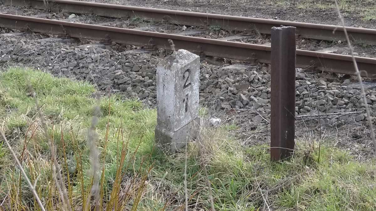 Rechts das Gleis der Strecke Haldensleben 0,0 - Weferlingen 31,91 mit km 1,8 (Stein)