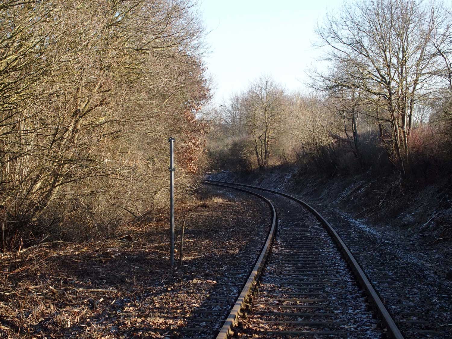 Am Beginn der Kurve ist noch schwach km 0,7 der Strecke Simmern - Boppard (3020) zu erkennen