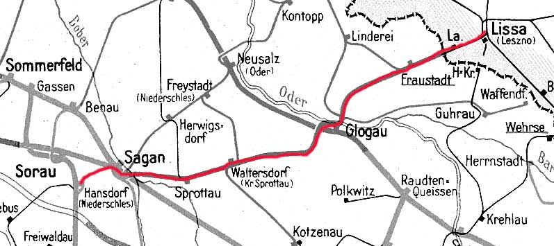 Lissa (Posen) 0,0 - Glogau 44,48 - Sagan 104,70 - Hansdorf (Niederschl) 115,76 (1918)