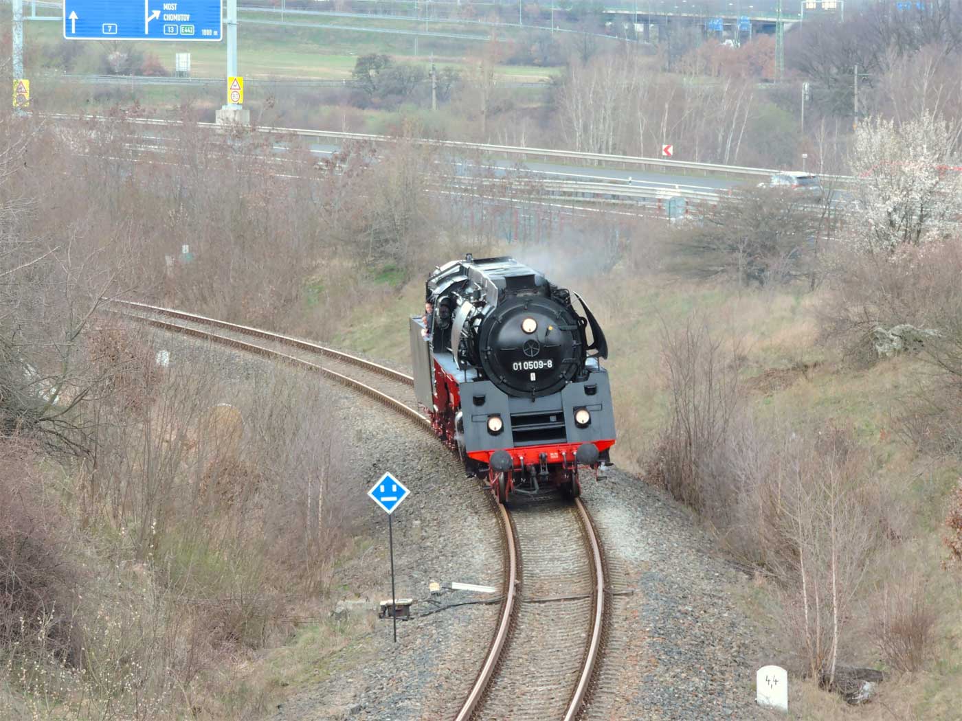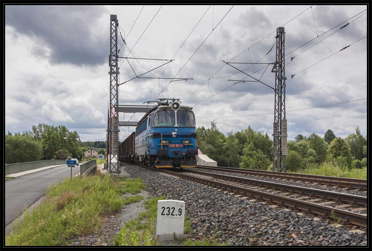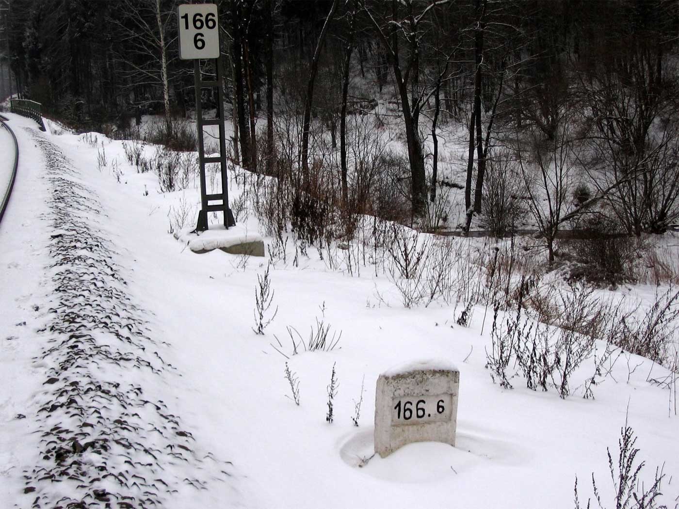 km 233,3 (Stein) und km 233,4 (Tafel) zwischen Tršnice (Tirschnitz) und Cheb (Eger) - Blick Richtung Cheb (Eger)