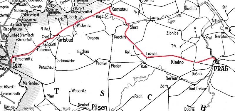 Prag-Bubna / Praha-Bubny 0,423 - Kladno / Kladno 28,04 - Krupa / Krupá 65,84 - Gnadendorf / Milostín 71,57 - Grenze Protektorat Böhmen und Mähren/Sudetengau 72,70 - Satkau 81,74 - Saaz Stadt 102,40 - Komotau 125,17 - Karlsbad ob Bf 185,38 - Eger 237,36