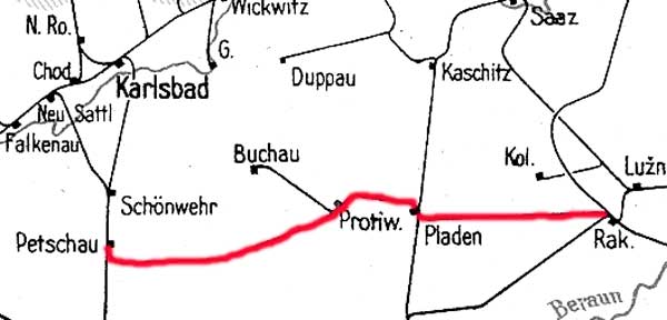 Rakovník (Rakonitz) 0,0 - Šanov (Schanowa, 1939–45 Schönau) 8,358 - Grenze Tschechoslowakei/Sudetenland 9,685 - Pschoblik (Pšovlky) 10,993 - Pladen (Blatno u Jesenice) 27,764 - Protiwitz (Protivec) 47,206 - Petschau (Bečov nad Teplou) 87,962