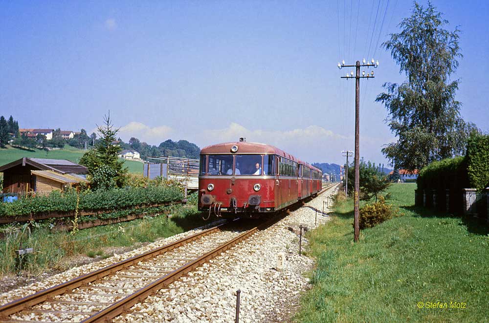 Gute alte Eisenbahnzeit? Mitte der 80er mitnichten noch auf allen Strecken. Die Nebenbahn Rosenheim – Mühldorf - Plisting hatte in dieser Zeit ein ganz besonderes Kuriosum zu bieten. Die Strecke wies sich in „indirekter Proportionalität“ gegenüberstehende Verkehrsströme und Kunstbauten auf. Sprich – los war nix, aber der Streckenunterhalt aufgrund einer großer Innbrücke relativ aufwendig. Als nun die ein Schaden an der Brücke auftrat, wurde die Strecke für Jahre unterbrochen. Soll man es nun als „besonders flexibel“, oder aber als Armutszeugnis bezeichnen, was man bei der DB daraufhin anstellte? Beidseits der Widerlager wurden provisorische Bahnsteige erreichtet, die Brücke mit Holz verkleidet und überdacht, damit es keinem „Anders“ wurde in diesen schwindelnden Höhen, und die Fahrgäste legten die mehreren hundert Meter also zu Fuß zurück. Dort wartete dann wieder der „Anschluss-Zug“. 798 764 steht hier mit ihrem N5371 am Halt „Innbrücke Süd“ und wartet auf „Wandergäste“ von Innbrücke Nord.
