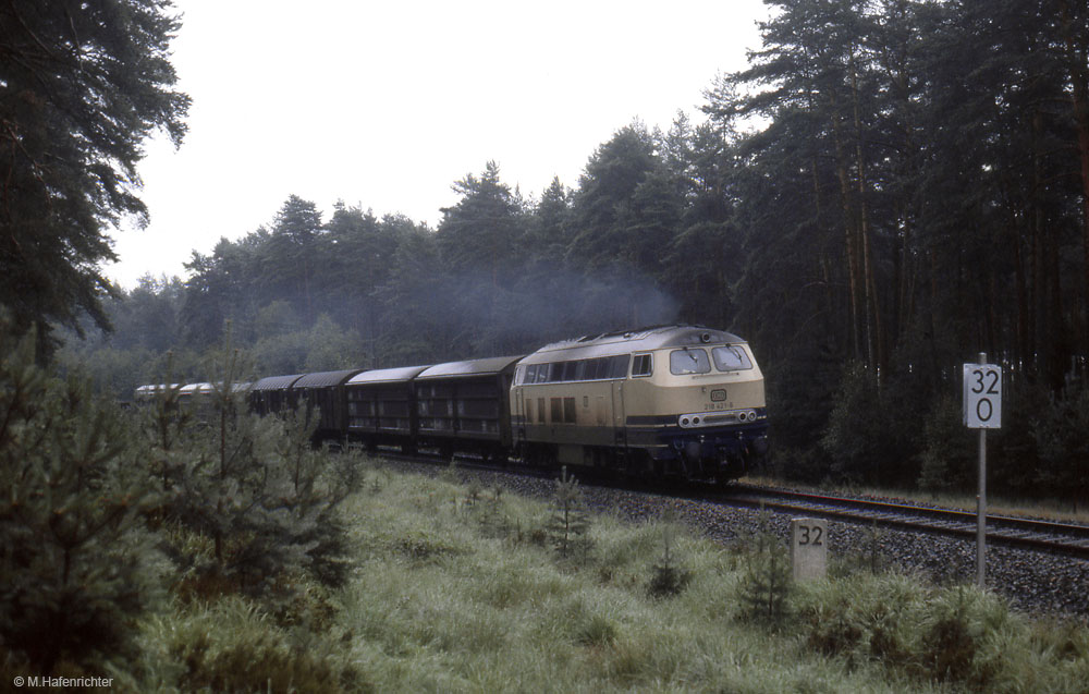 218 421 mit dem Dg 63506 (Furth im Wald - Schwandorf) am 26.07.1981 am km 32,0 bei Neubäu