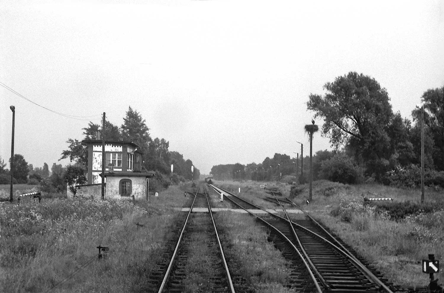 Modła (Modlau) - Stellwerk, Kilometerstein km 95,7 und Storchennest