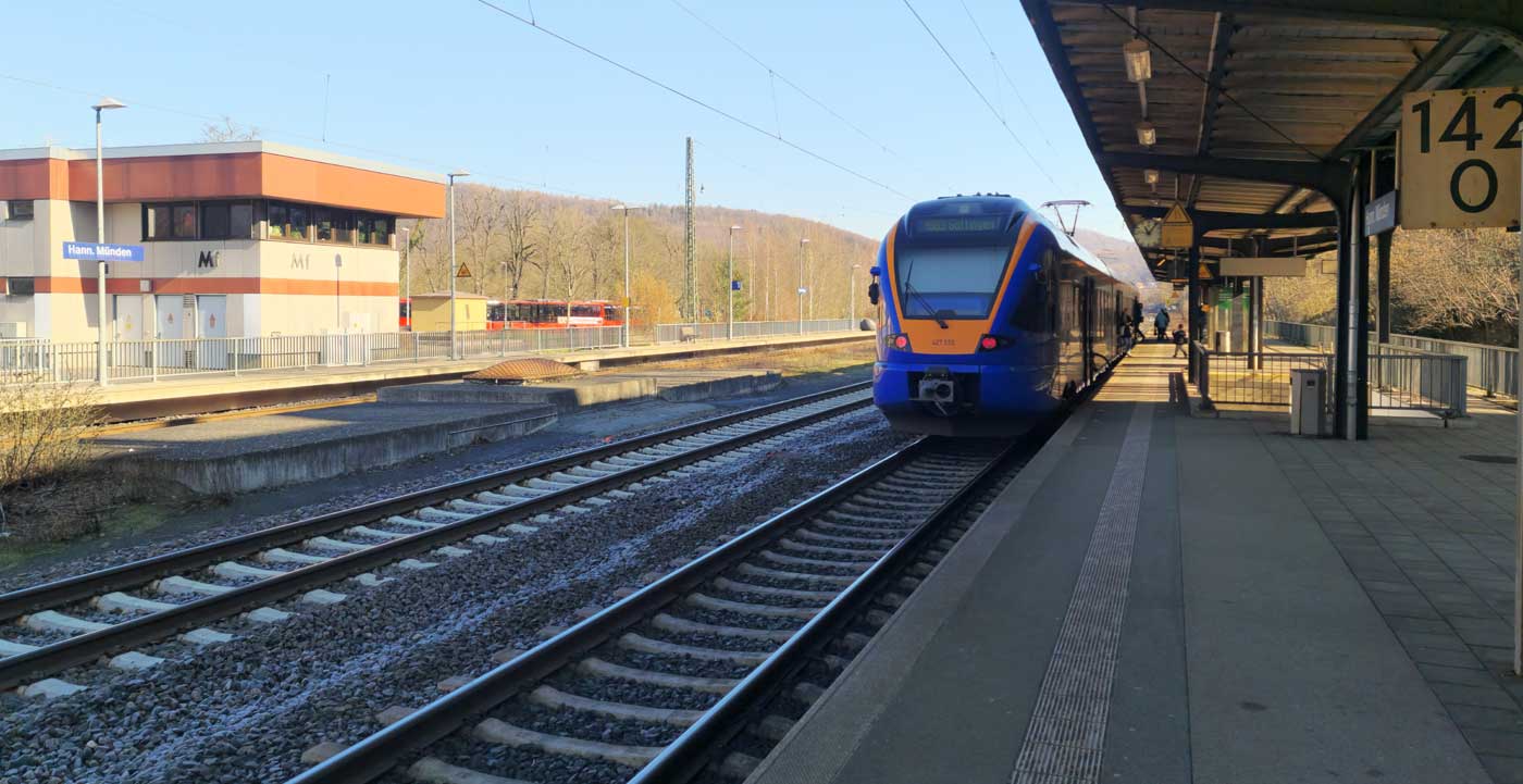 | Hannoversch Münden | 142,03 | km 193,54 der Strecke Halle (Saale) Hbf 0,01 - Sangerhausen 59,22 - Nordhausen 97,07 - Eichenberg 170,48 - Hann. Münden 193,54 |