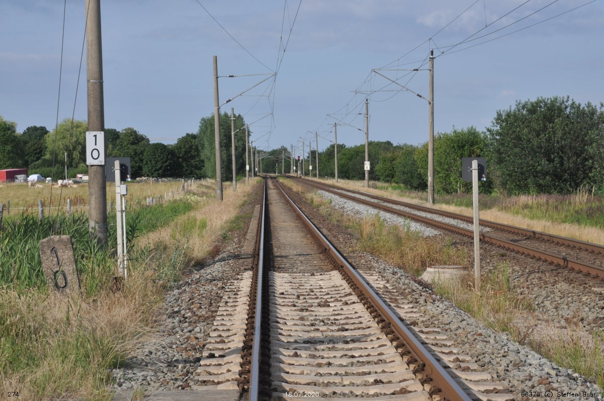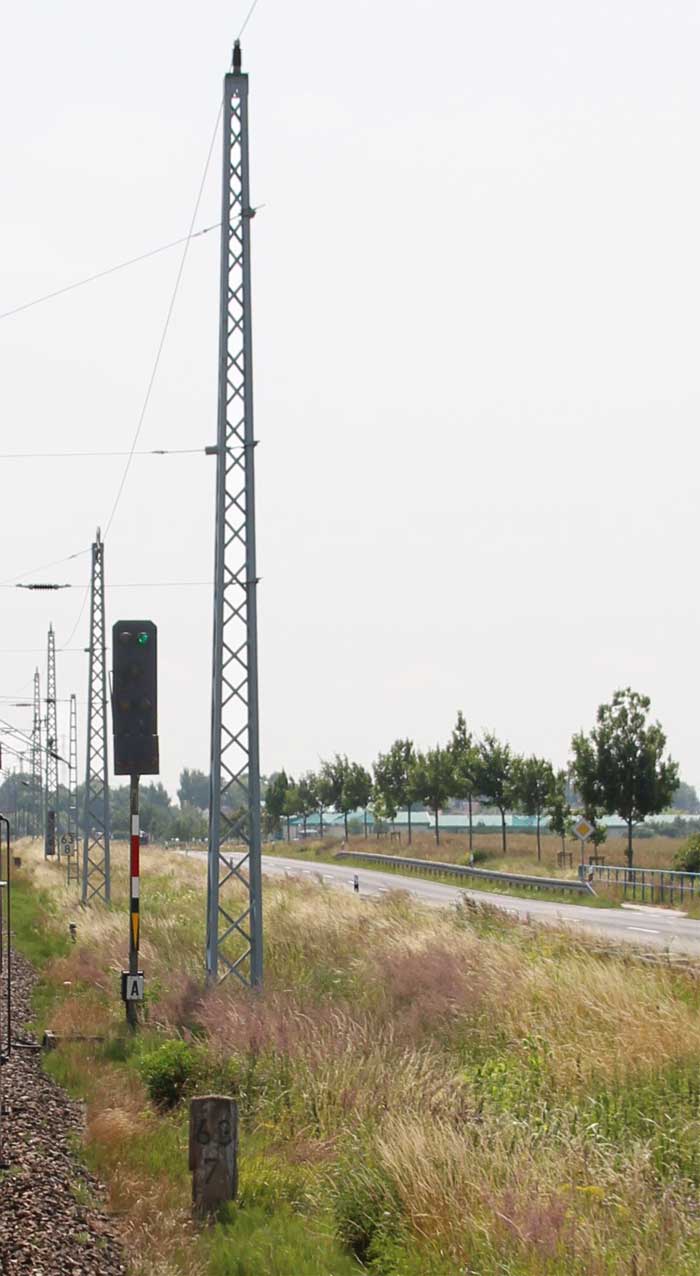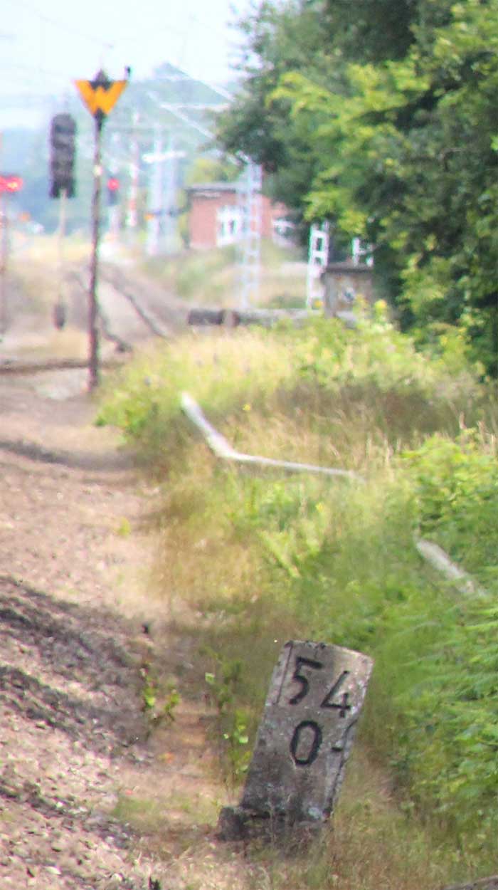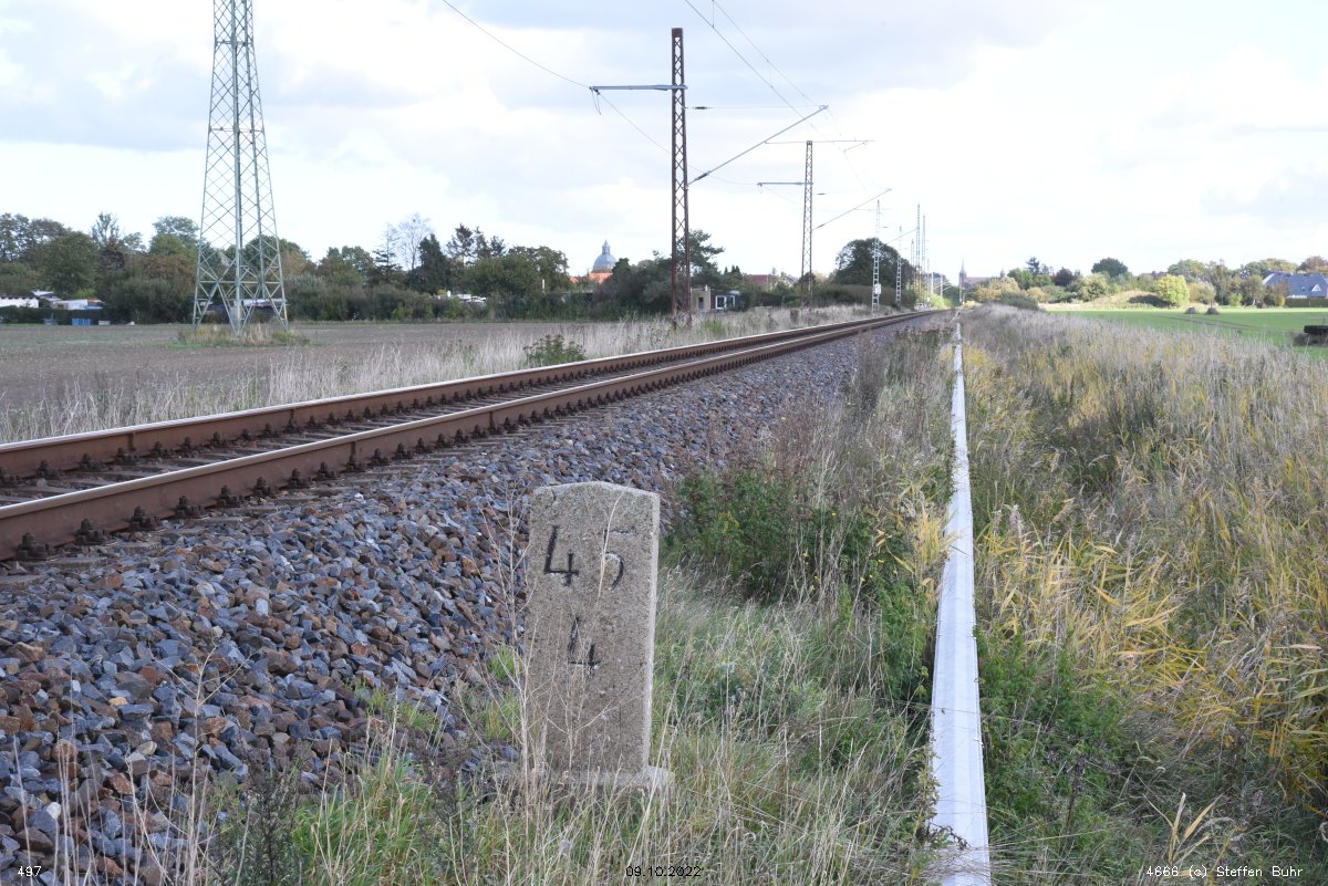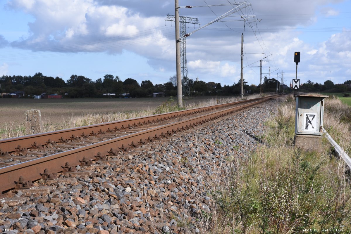 km 1,2 (Tafel und Stein) gehört zur Strecke Abzw Riekdahl, W 1 km 0,87 - Rostock Seehafen Nord km 9,228 (6443)