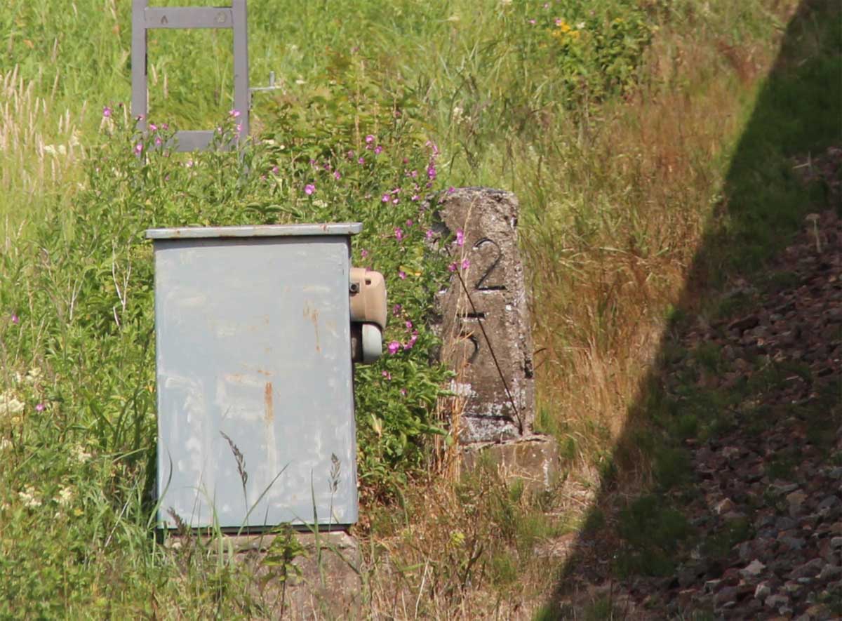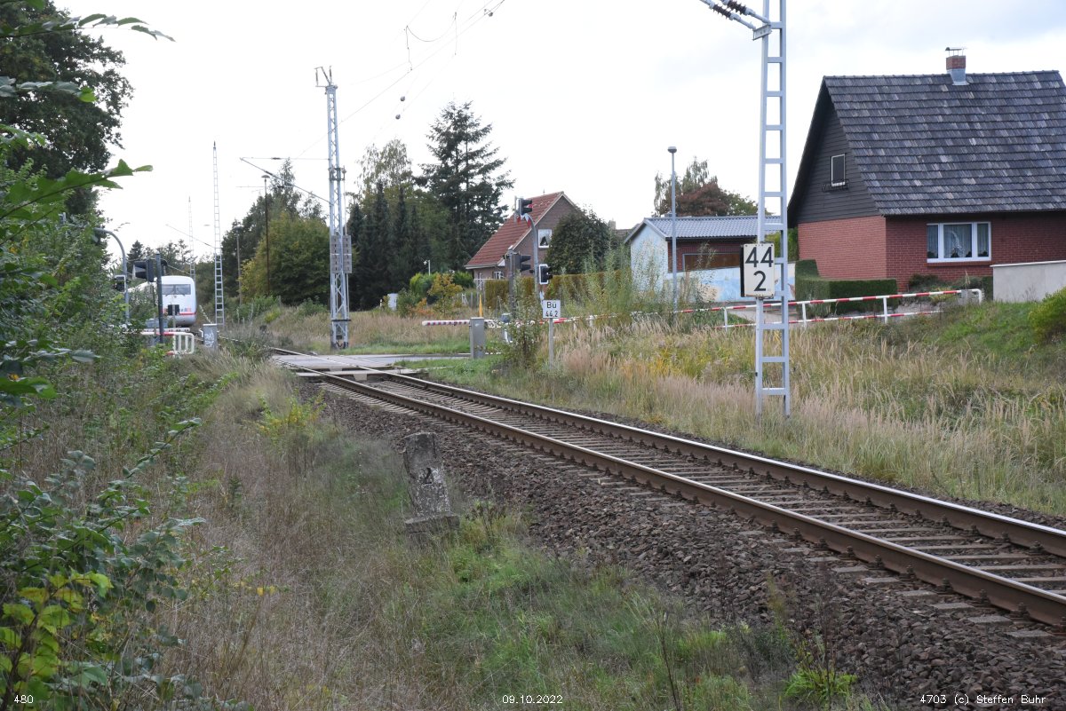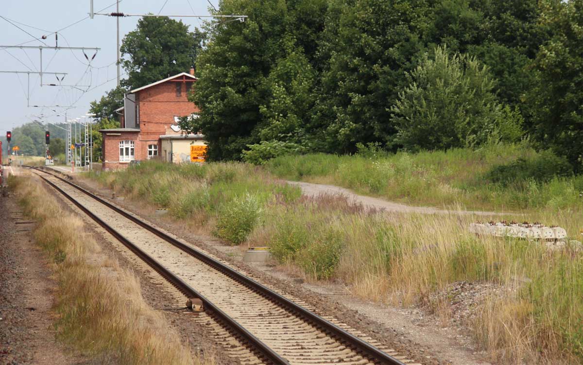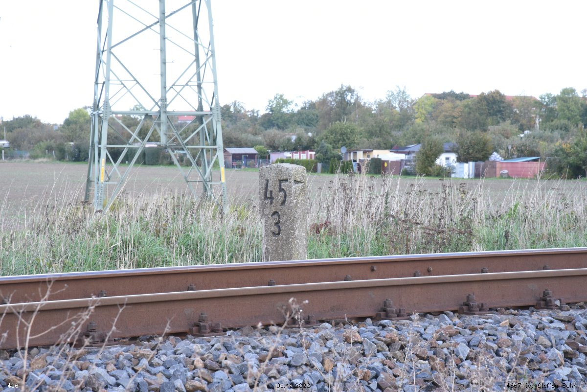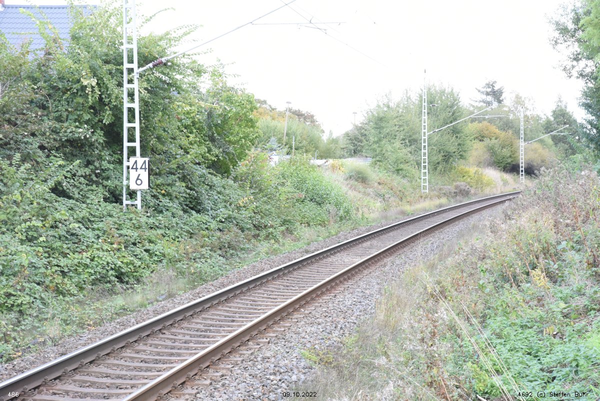 km 1,2 (Tafel und Stein) gehört zur Strecke Abzw Riekdahl, W 1 km 0,87 - Rostock Seehafen Nord km 9,228 (6443)