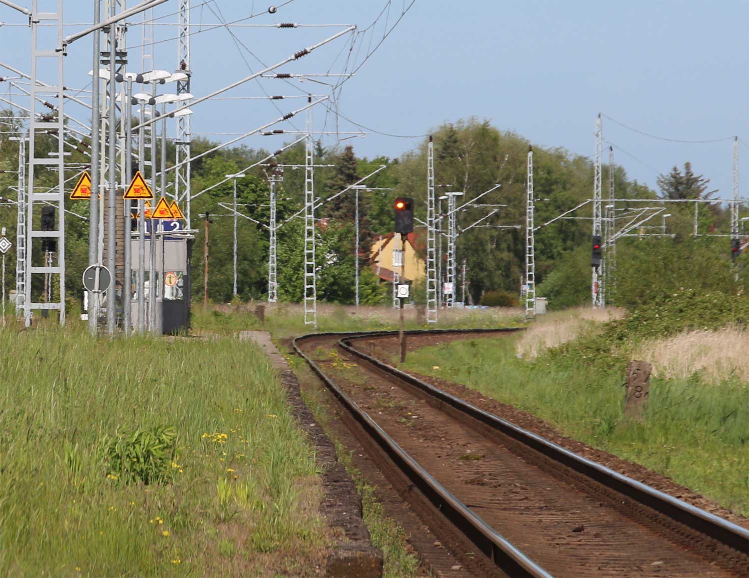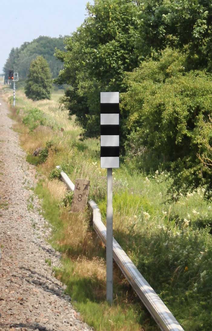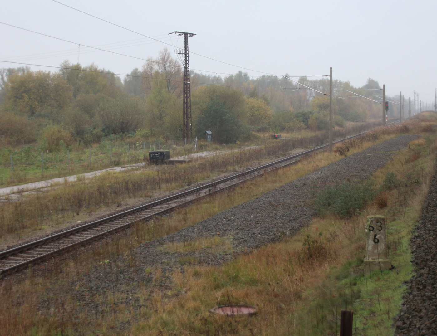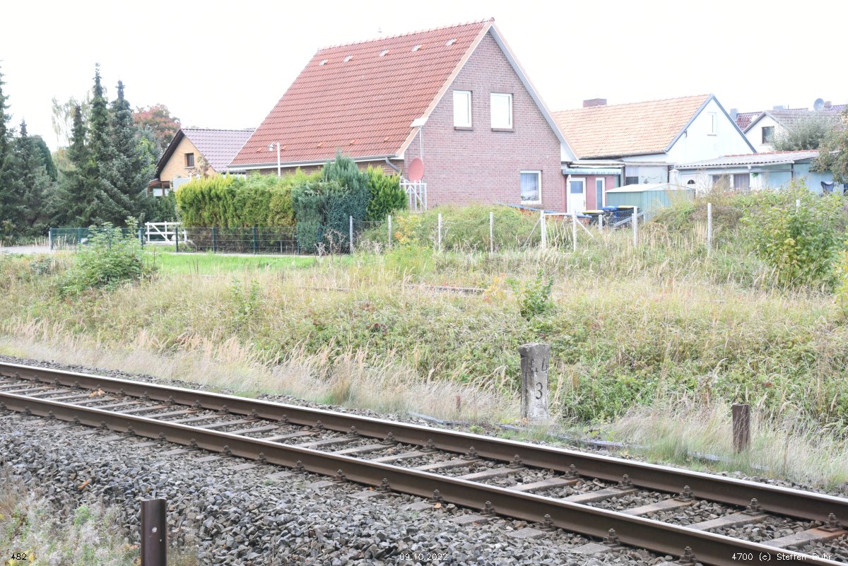 km 1,2 (Tafel und Stein) gehört zur Strecke Abzw Riekdahl, W 1 km 0,87 - Rostock Seehafen Nord km 9,228 (6443)