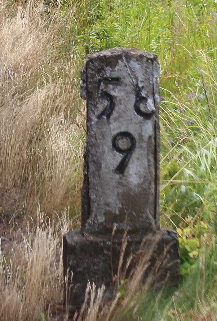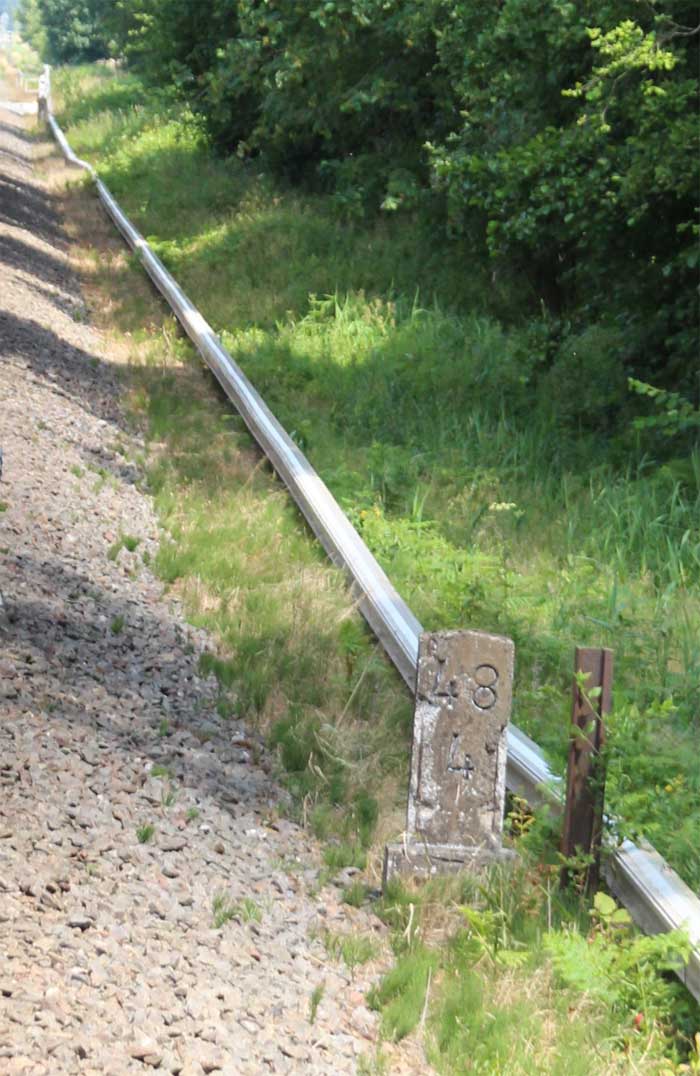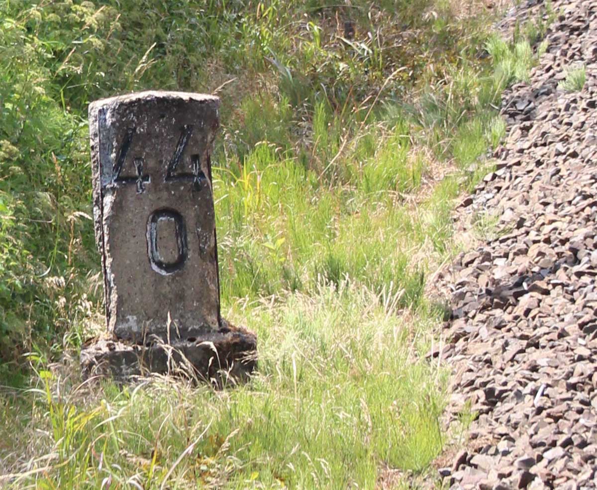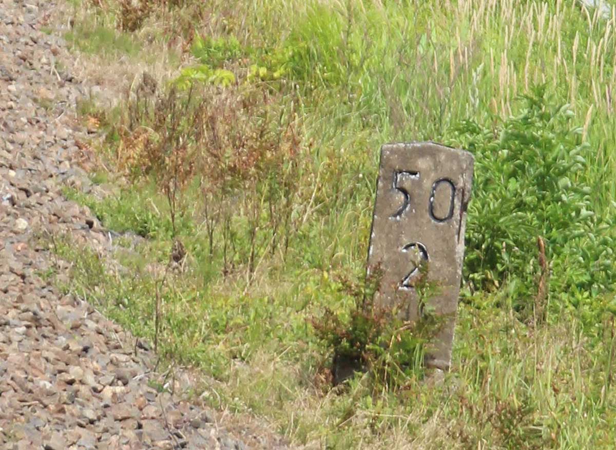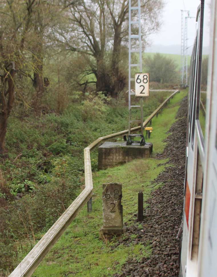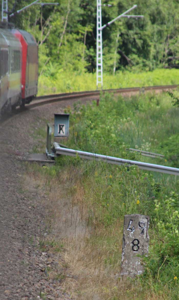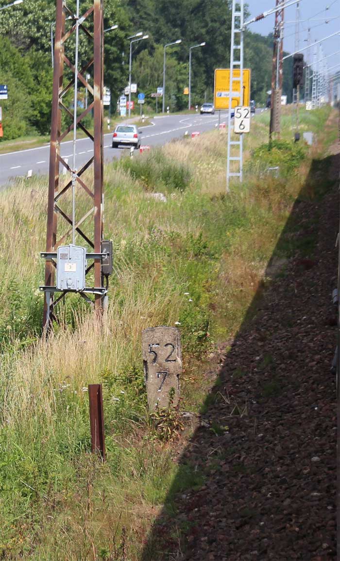 km 0,6 (Tafel); km 0,7 (Stein); km 0,8 (Tafel und Stein) und km 0,9 (Stein) gehören zur Strecke