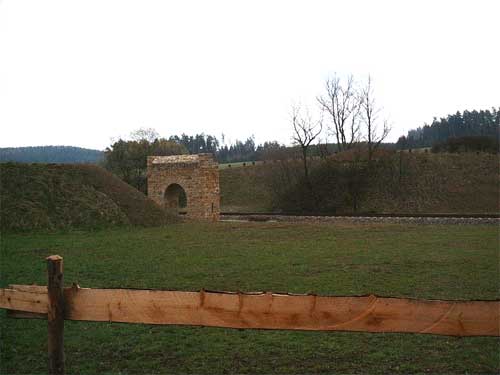 Im Vordergrund ein Fundament der 1946 abgebauten Oberleitung (Reparationsleistungen an die Sowjetunion)