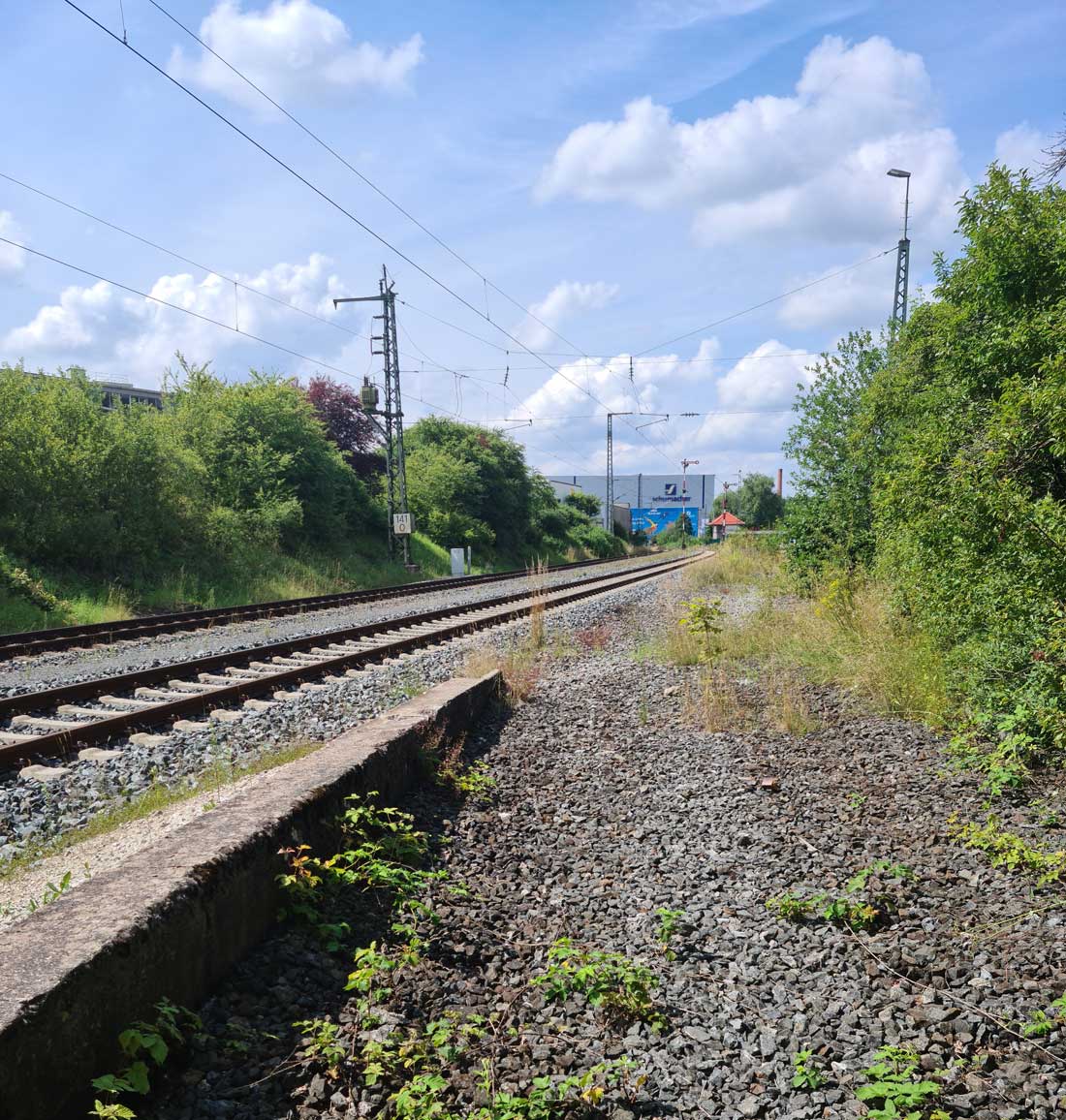 Hinter dem Bahnhofsgebäude befindet sich die ehemalige Strecke nach Rossach