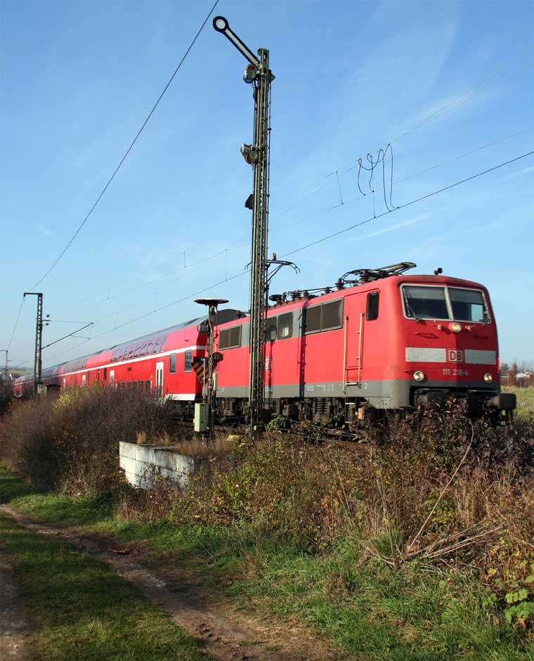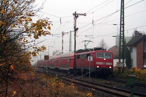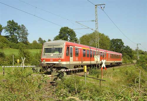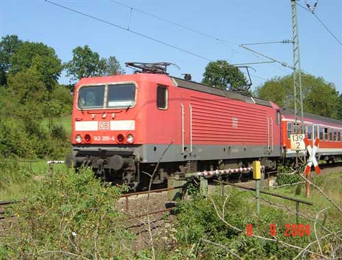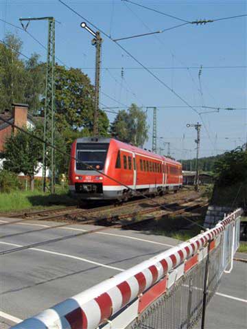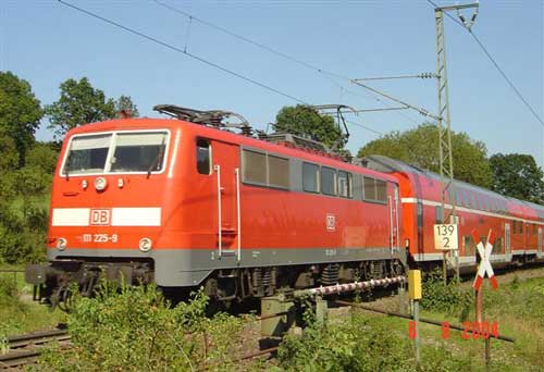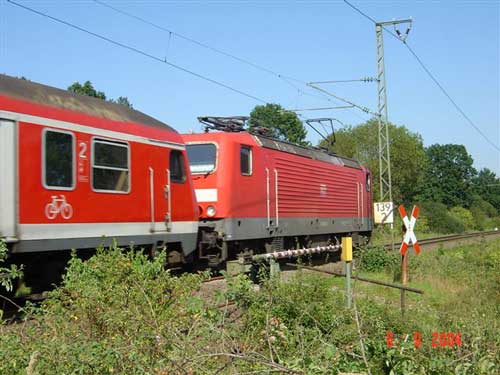 BÜ km 139,2 Das besondere am Bild ist, dass die Lok in Fahrtrichtung vor dem Steuerwagen läuft (Steuerwagen evtl. defekt). Kenner beachten den Stromabnehmer (Foto: Dirk Ammon, September 2004) |