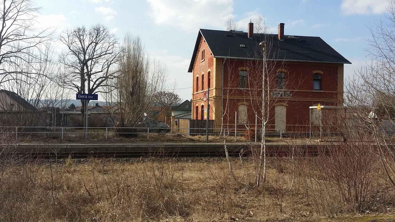 Im Vordergrund das Gleis der Strecke Leipzig-Leutzsch - Probstzella - Probstzella, dahinter das Gleis der Strecke Gera Süd - Weischlitz. Zwischen den beiden Gleisen ist der alte Bahndamm zu sehen, als die Strecke nach Weischlitz noch in Gera-Röppisch (früher Wolfsgefärth) bis 1892 endete.