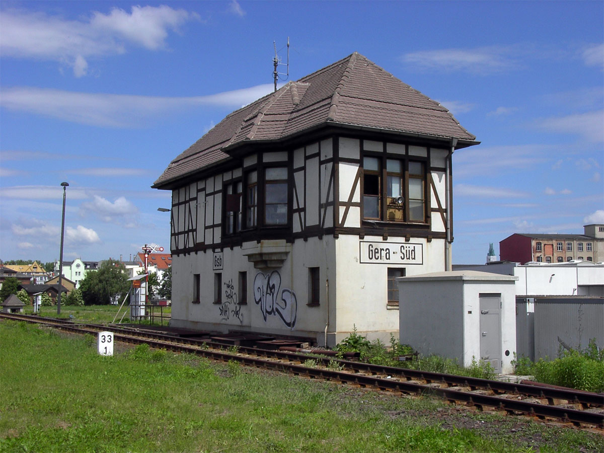 | Gera Süd | -0,12 | km 74,60 der Strecke (Leipzig Hbf 0,0) - Leipzig-Leutzsch 6,69 - Zeitz 44,61 - Gera Hbf 72,81 - Saalfeld (Saale) 140,01 - Probstzella 164,99 - Grenze DDR/BRD 166,66 = 52,91 - (Hochstadt-Marktzeuln 0,0) |