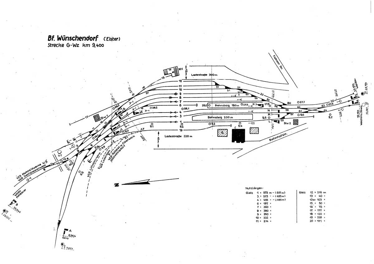 | Wünschendorf (Elster) | 9,40 | km 27,90 der Strecke Werdau (Sachs) 0,0 - Weida 32,58 - Mehlteuer 67,66 (WM) (bis ca. 1900) |