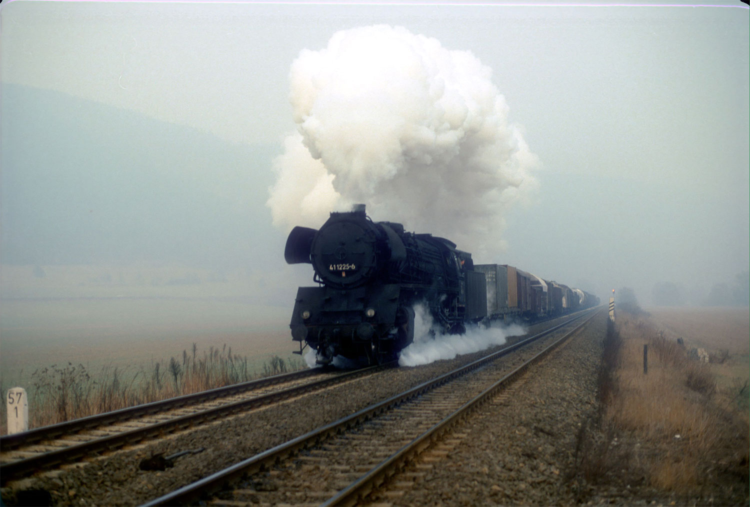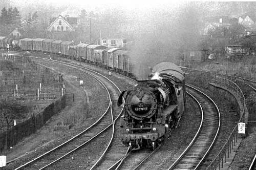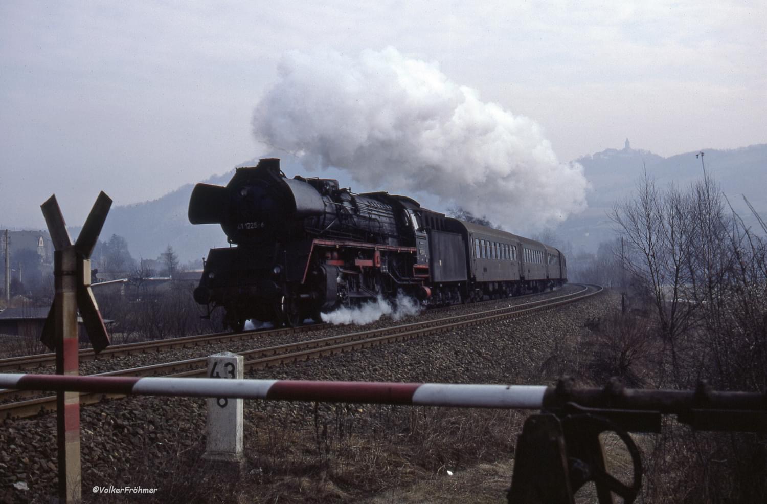 Diese Aufnahme stammt vom 14.12.1980 und zeigt die 44 0757 bei der Einfahrt in den Bahnhof Saalfeld. Der Tannenzweig an der Rauchkammer deutet auf die Vorweihnachtszeit hin, die es auch in der DDR gab. Rechts km 139,5 der Strecke Leipzig/Leutzsch - Probstzella Foto: Henning Gothe |