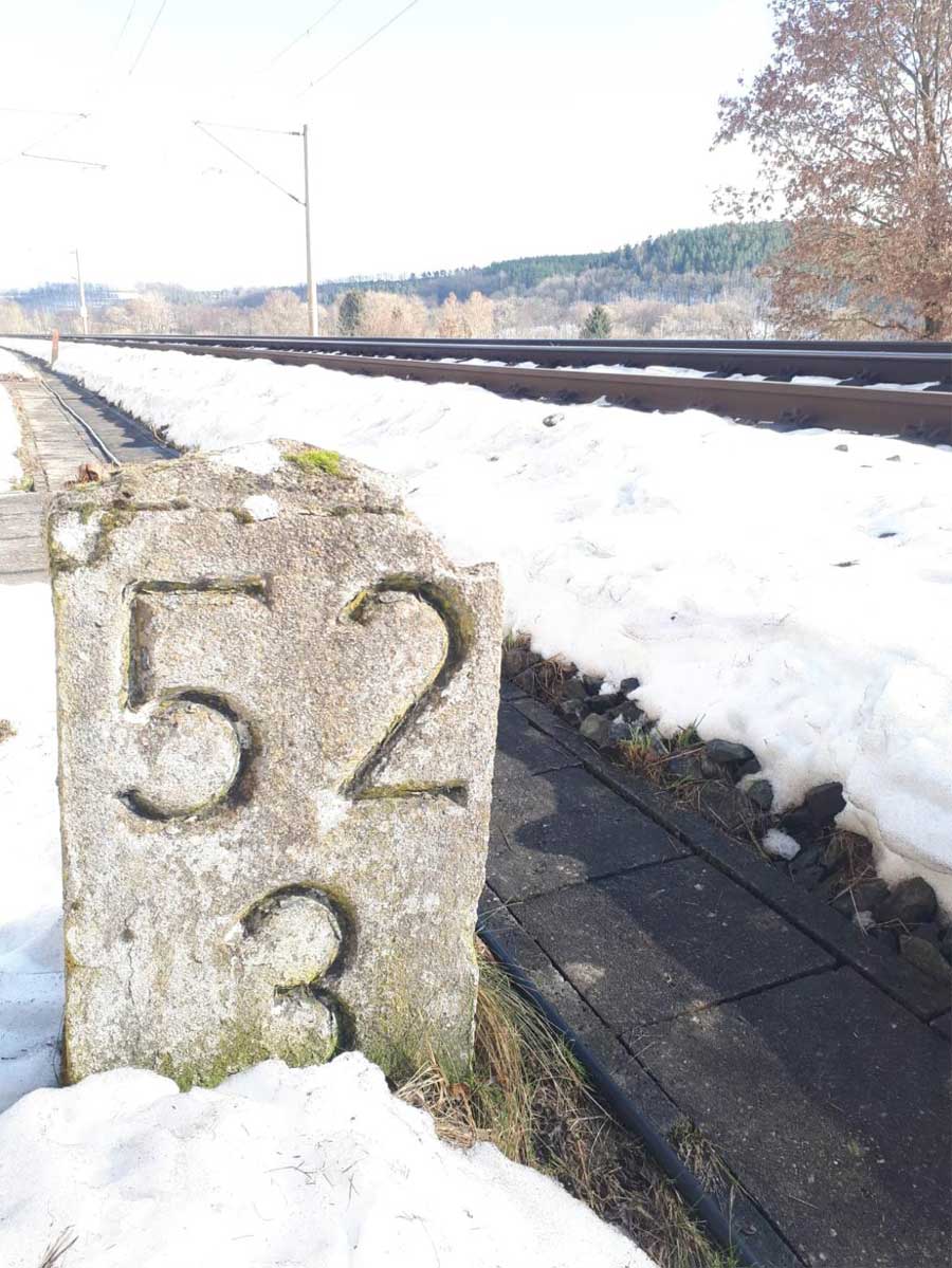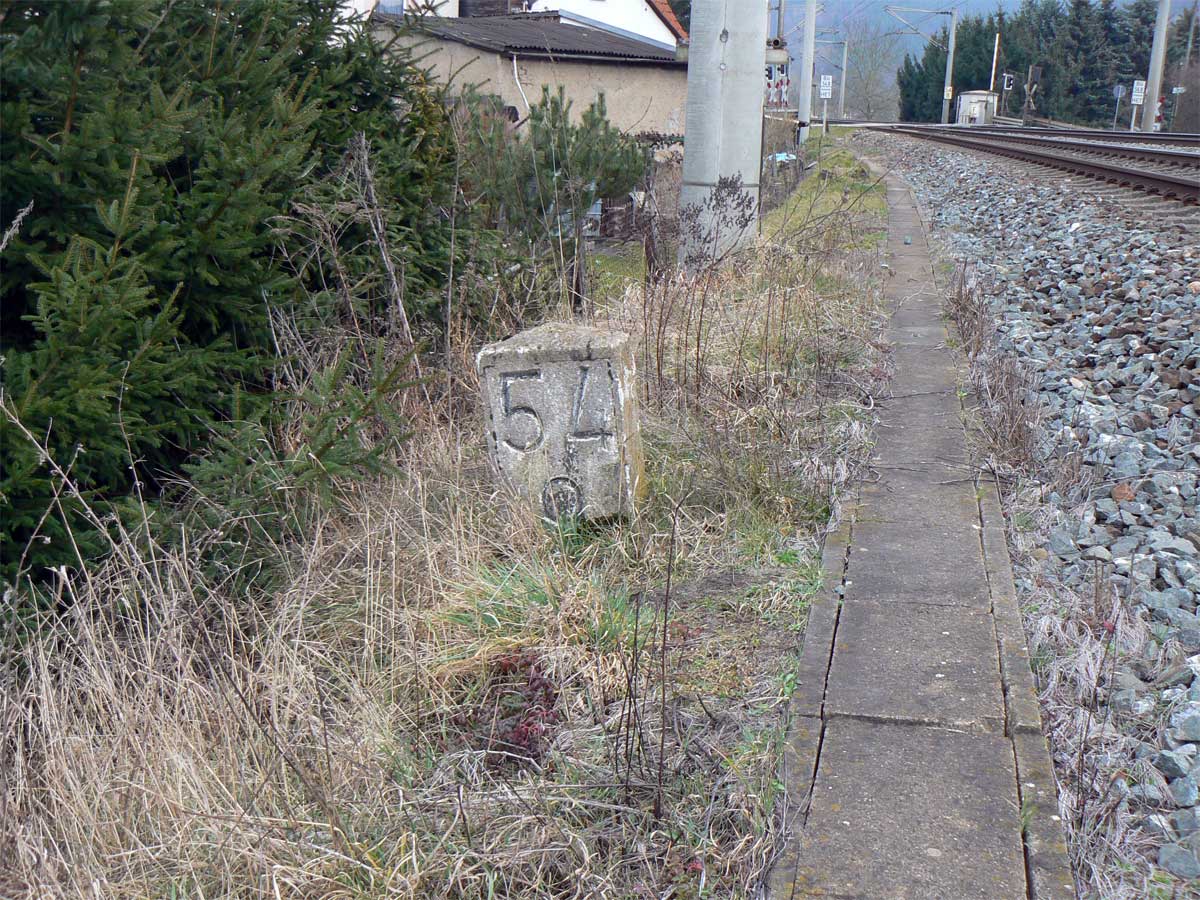 Links ein Stein der Strecke Arnstadt Hbf 0,0 - Saalfeld (Saale) 47,81