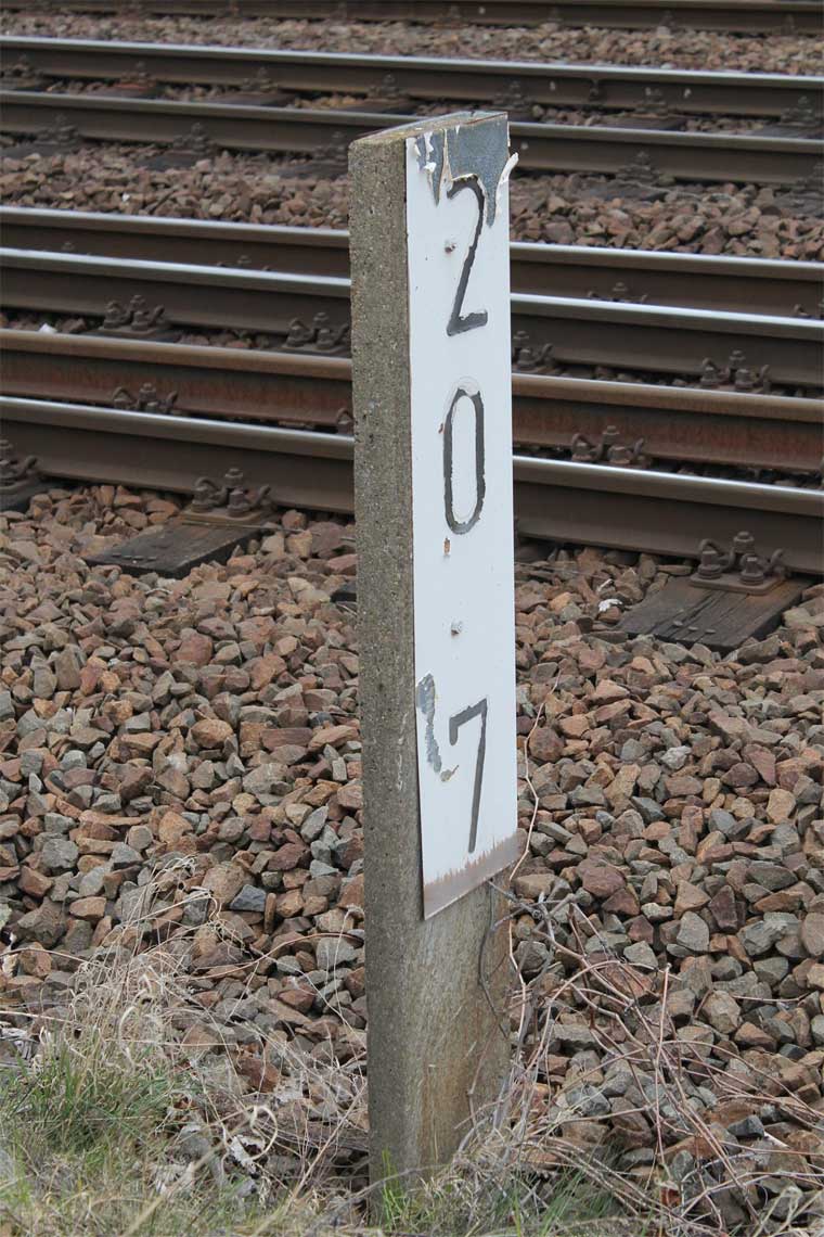 Mehlteuer 67,653 (WM) (bis ca. 1900) km 0,0 der Strecke Werdau (Sachs.) - Werdau West - Kilometerwechsel km 1,920 = [0,000 - Weida 32,58 - Mehlteuer 67,653] (WMC - WM) (ab ca. 1900) |