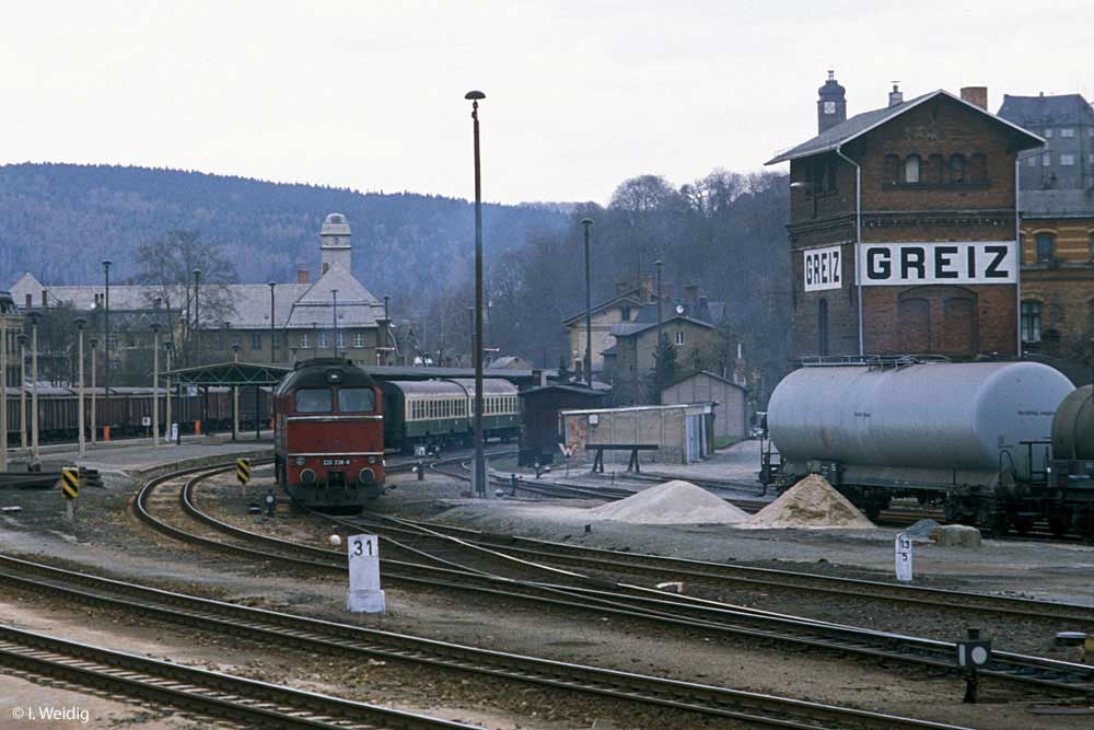 | Greiz | 13,825 | km 30,665 der Strecke Gera Süd -0,12 - Wünschendorf (Elster) 9,40 - Greiz 30,665 - Weischlitz 59,90 (GWz) |